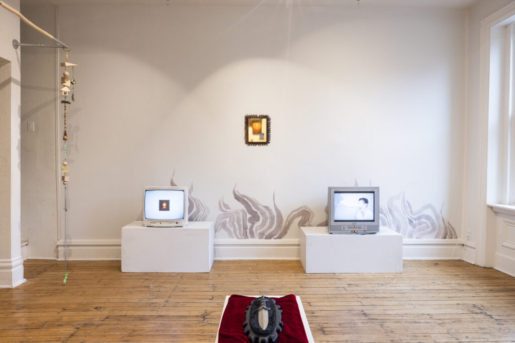 Left: The Burning House by Brent Nakamoto, video (2025). Right: Stuck in Saṃsāra by Martin Castro, video (2012). On the wall is Jon Chao’s a warmth, a silence (polished brass, walnut, and found photo, 2024). In the middle of the room is Nakamoto’s Knife (pewter, 2025), and hanging on the wall is Anne Chen’s Rituals for Small Openings (mixed media, 2025).