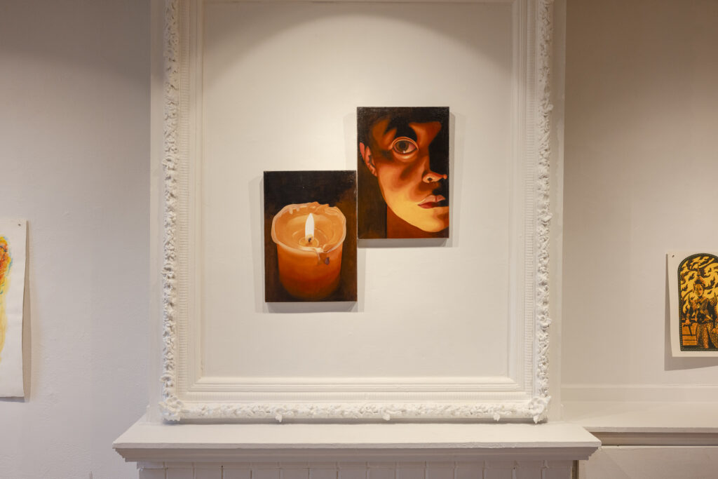 A spiral motif also appears repeatedly in the show, both literally and figuratively. In Martin Castro’s video piece Stuck in Saṃsāra, after which the show is named, we see the artist quite literally stuck in a spiral, getting punched in the face on repeat. As viewers, we are tiptoeing on the edge, anticipating the blow until it finally happens and the cycle starts over again. On one wall, a mural portraying spiral-like red flames engulfs the works installed on top. It pulls us into the blaze, into the internal world where these pieces live. We see the spiral again in Anthony Park Kascak’s Spiral, Bloom, in which his dog Bonzu is situated, mouth open, at the center. Our eye wants to follow the line around and around until we reach one end and reverse the direction. In Fortune’s Wheel Keeps Turning, Eriko Hattori depicts a figure tied to a wheel surrounded by flames while a fawn, already burning, bounds towards them. For me, this piece feels like a poignant interpretation of internal, personal suffering. There is no clear power imposing this suffering, no obvious thing that has tied the figure down. The figure wears a demon mask that smiles grotesquely, an image I interpret as either its complicity in the situation or a literal mask to hide their pain. The fawn, an innocent creature, easily startled, leaps forth without a clear path to escape the fire.